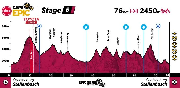 El penúltimo día transcurre por los mejores senderos de Stellenbosch, auténtico santuario del MTB en Sudáfrica. Desde la primera subida al Botmaskop, los corredores enlazarán con zonas míticas como Banhoek Berms, Klipwerf, Porcupine e Inferno. Una etapa pensada para los especialistas en XCO, donde el ritmo explosivo y la técnica marcarán diferencias.