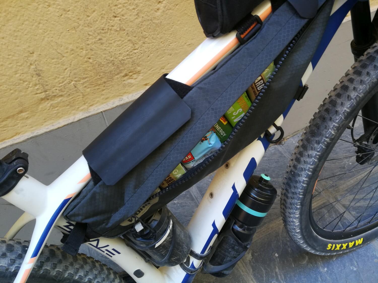 En cuanto a material, tampoco tenía muchas opciones y fui con el material que tenía: mi bici rígida de mtb, las bolsas de bikepacking que ya tenía, pedí un Garmin eTrex a un amigo y cogí una esterilla ultralight y una funda de vivac. Probé el montaje de varias maneras y al final puse las barras aero para tener dos posiciones de pedaleo y poder atar la funda de vivac y la esterilla en ellas. Tenía 3 cargas de baterías para la luz delantera, un frontal, dos powerbanks y, súper importante, los auriculares (soy muy fan de la música). También llevaba material para ser autosuficiente si tenía problemas mecánicos: cámaras, puntera, radio, multitool, enganches rápidos, parches, bomba, cinta aislante, etc.