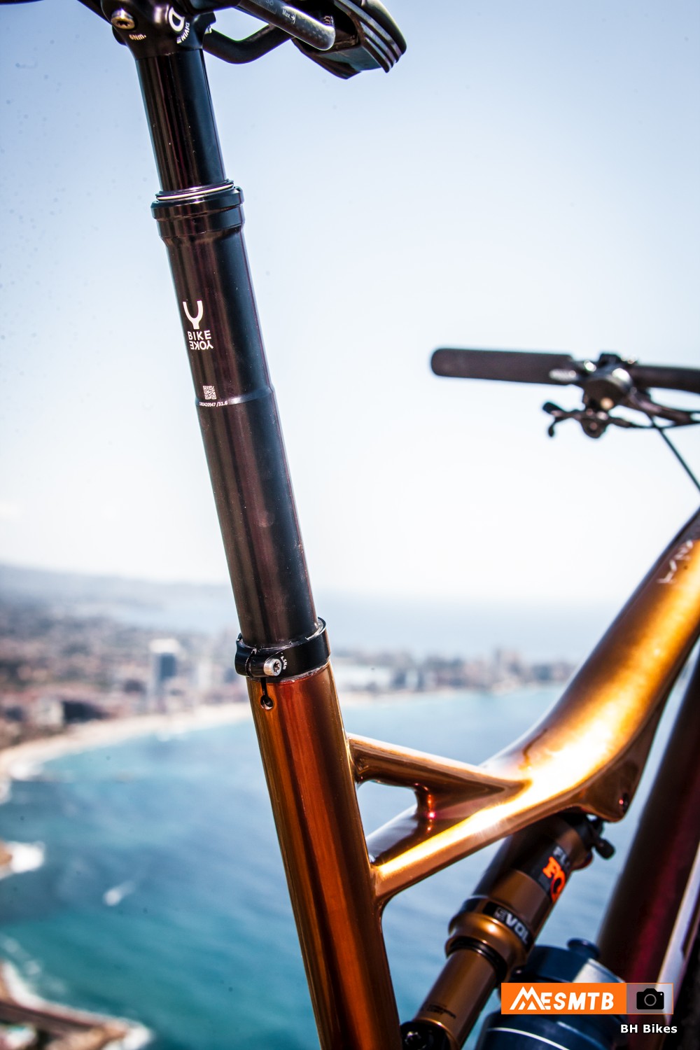 BH aporta potencia de aluminio y manillar de carbono. En este caso usan una potencia convencional y no la que permite integrar el sistema de herramientas FIT. También podéis ver la entrada de cables por la dirección y la curiosa disposición del mando de la tija telescópica por debajo y un poco avanzado al de bloqueo de la suspensión.