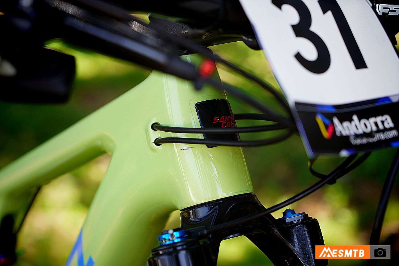 Lo que se ve tras la cadena FSA son los soportes de fijación del guía cadenas que la Santa Cruz Blur trae de serie y que han desmontado. Curiosamente, una salida de cadena le impidió pelear por la victoria en el Short Track cuando iba en cabeza.