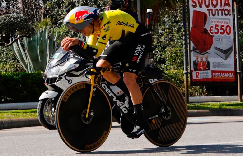 La contrarreloj inicial de la Tirreno-Adriático dejó una de las imágenes técnicas más llamativas de la temporada. Wout van Aert tomó la salida con una configuración extremadamente aerodinámica: rueda lenticular tanto delante como detrás, una combinación muy poco habitual en las pruebas de carretera.