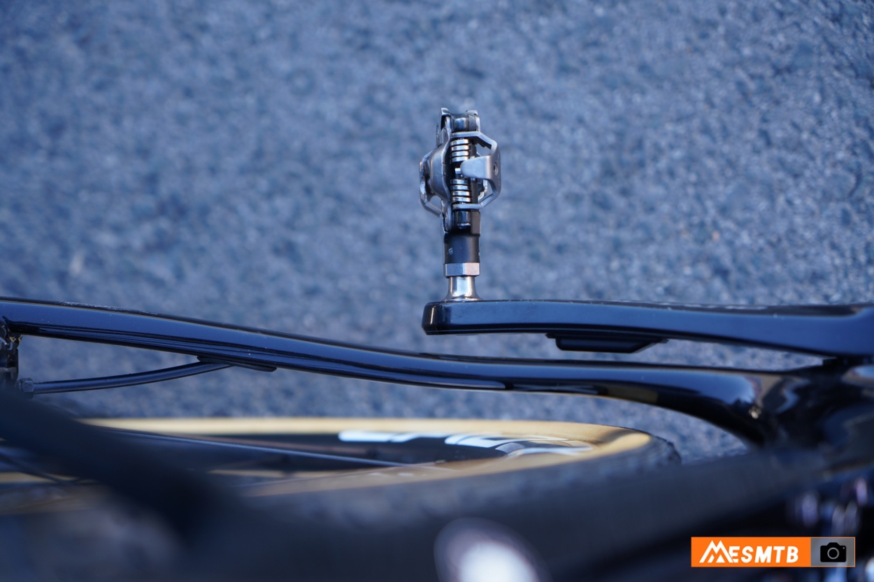 Pedales Shimano XTR y, curiosamente, también lleva medidor de potencia en la biela izquierda