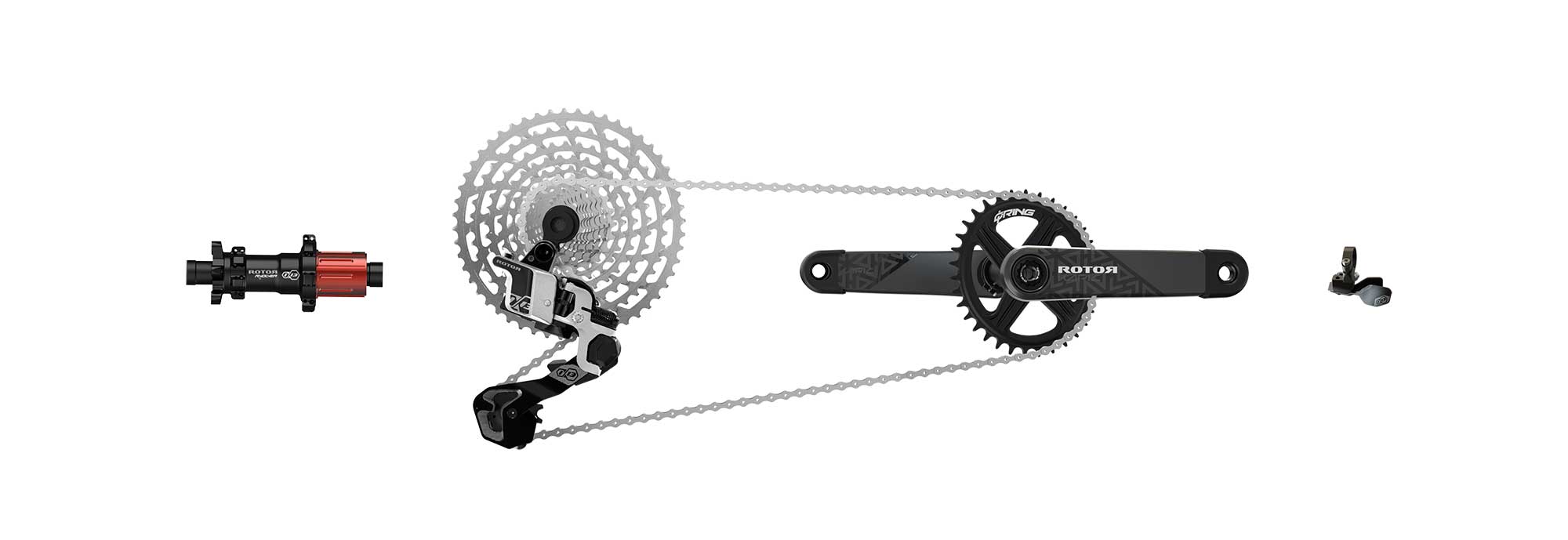 Incluye cambio trasero, mando de cambio, bielas KAPIC Carbon, cassette de 13 velocidades, bujes ROTOR RVolver de 13 velocidades, Plato ROTOR 1x y cadena