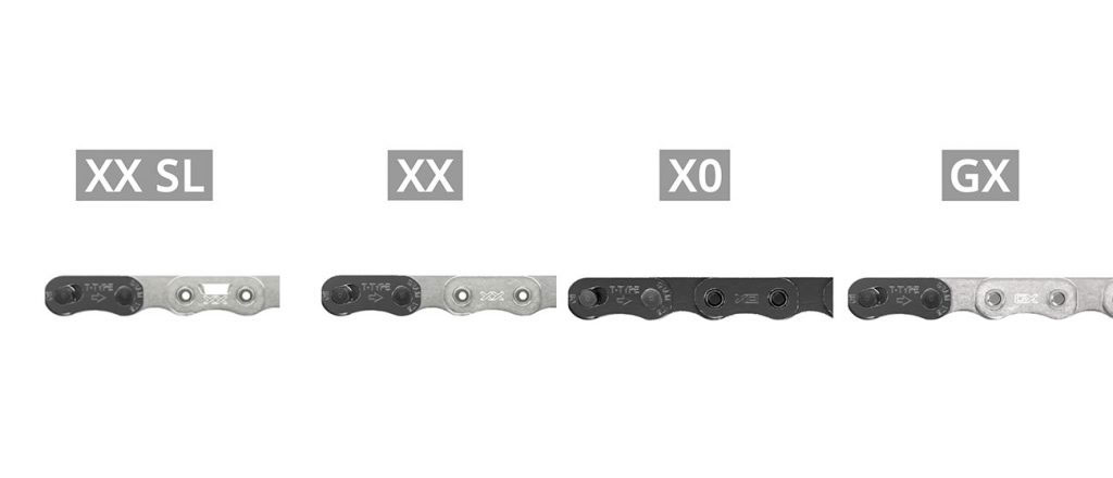 La del XX SL tiene eslabones perforados para rebajar el peso al máximo. La del XX y la el X0 son la misma, lo único que la del X0 tiene un tratamiento que le da el color negro y ninguna tiene eslabones perforados. La del GX es idéntica pero ya no tiene los pasadores huecos que tienen el resto. Es la misma cadena que usa el S1000. Así quedan sus precios y pesos.
