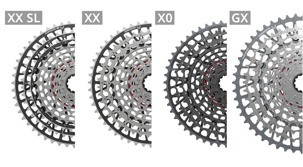 El XX SL tiene los 3 piñones más grandes de aluminio y el resto son de un solo bloque de acero. En el XX encontramos únicamente el piñón grande de aluminio. Los dos siguientes sond de acero y van cogidos al piñón grande, mientras que el resto es exactamente el mismo bloque de piñones de acero que el XX SL. En el caso del X0 el cassette es el mismo que el XX, pero con un tratamiento de color negro para darle una estética diferente. El cassette GX es totalmente de acero y usa el sistema de pins para unir los piñones del grande al 8o y del 9o al pequeño son de una pieza de acero. En el cassette del S1000 encontramos una construcción en la que anuncian que el bloque de piñones del 10 al 18 se reemplazable. Lo más diferente de este cassette es que es el único para núcleo Shimano HG, algo pensado de esta forma porque las ruedas de montaje económicas suelen venir con ese núcleo.