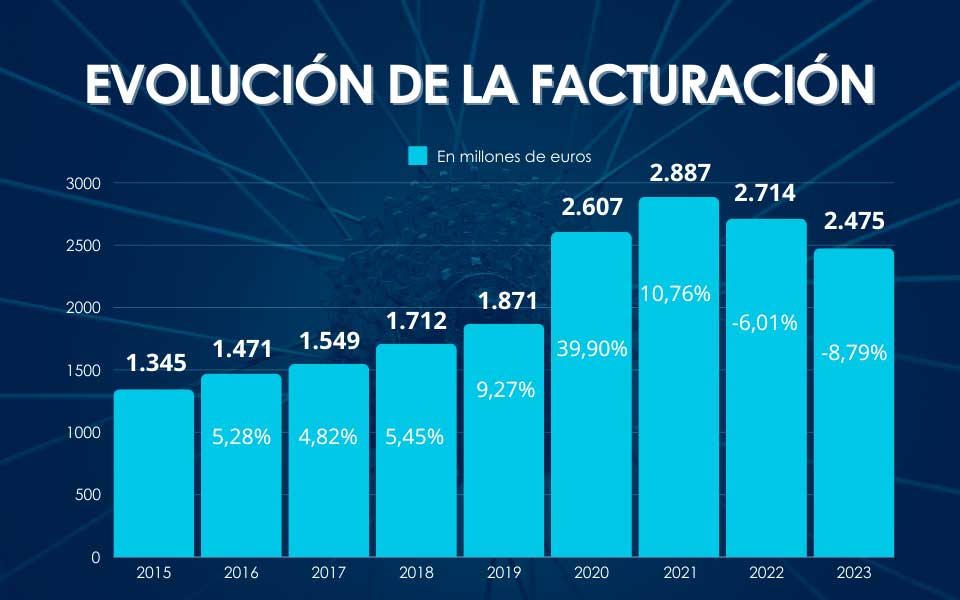 Del informe de AMBE sobre el sector de la bicicleta se extraen una serie de datos que dejan de manifiesto que la caída en ventas y facturación en España es evidente, pero que el sector sigue teniendo un movimiento importante, por encima de la era pre-covid. En total, la facturación de 2023 ascendió a 2.475 millones de euros con un total de 1.220.963 bicicletas vendidas. Una facturación un 32,3% mayor que en 2019.