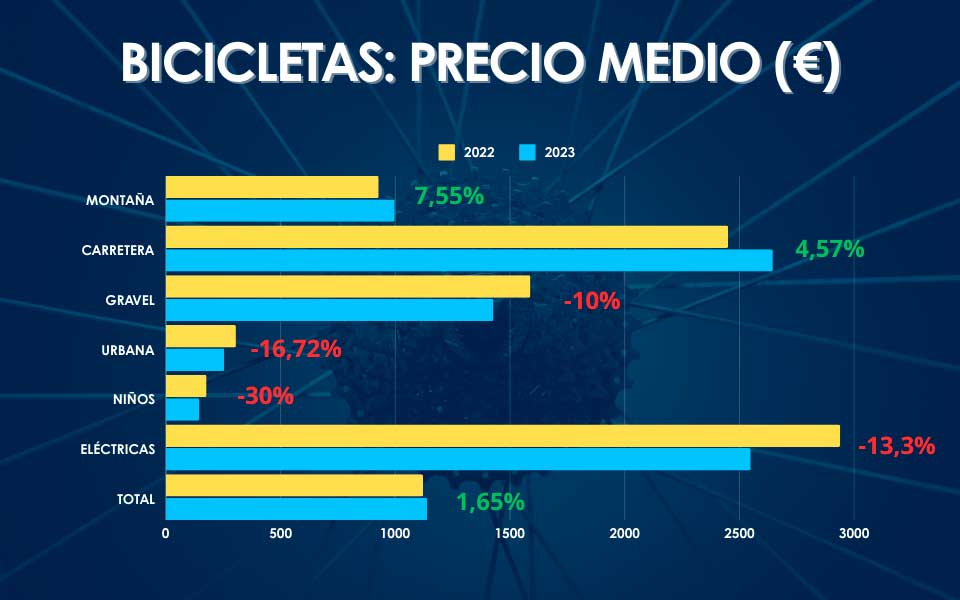 En cuanto al precios medios de las bicicletas vendidas en España, en 2023 se situó por encima de los 1.000 euros por segundo año consecutivo, alcanzando los 1.139,15 euros frente a los 1.120,7 euros de 2022.