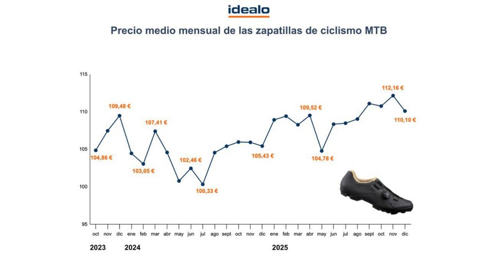 Según un análisis de precios realizado por idealo.es sobre los mejores meses para comprar zapatillas de ciclismo, basado en más de 14.000 modelos en España (incluyendo zapatillas de MTB y de carretera) entre octubre de 2023 y diciembre de 2025, se observan patrones claros de variación de precios que puedes aprovechar: