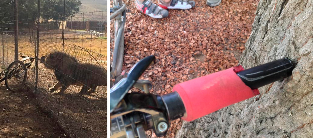 La nota curiosa del día la ha protagonizado uno de los Epic Trippers, bikers que toman parte en algunas de las etapas de la carrera de forma aislada. En Sudáfrica hay que estar atento cuando dejas tu bicicleta apoyada en algún lugar. Sino, mirar la imagen. Por suerte el león seguía una dieta sólo a base de silicona, y no se comió nada más de la bicicleta.