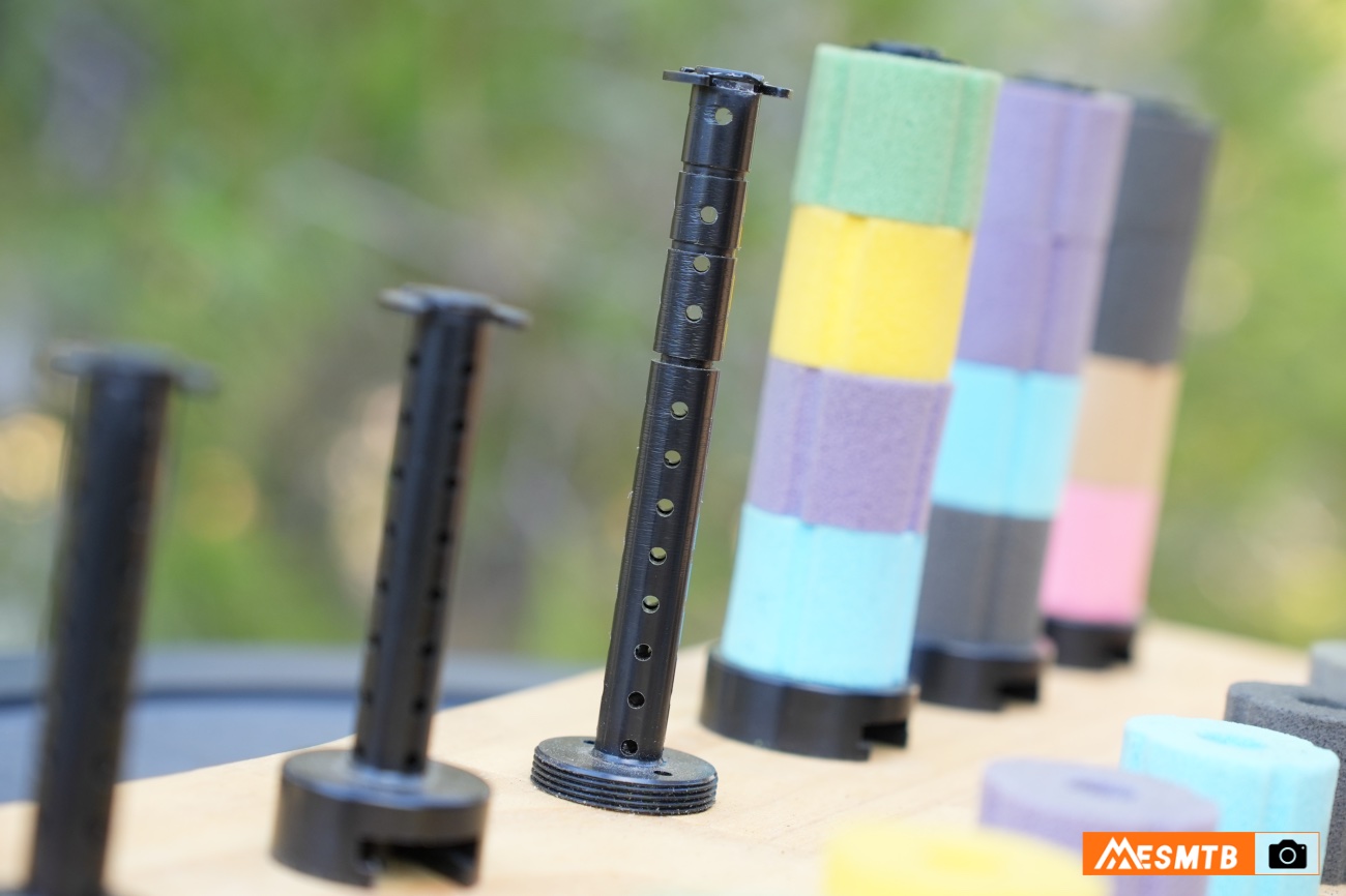 El montaje es muy sencillo: una pieza de soporte se fija al tapón de la cámara, se introduce la espuma con el nivel de dureza elegido y todo queda asegurado con un clip. La espuma no toca el pistón en ningún momento, evitando fricciones indeseadas que pueden acelerar su desgaste.