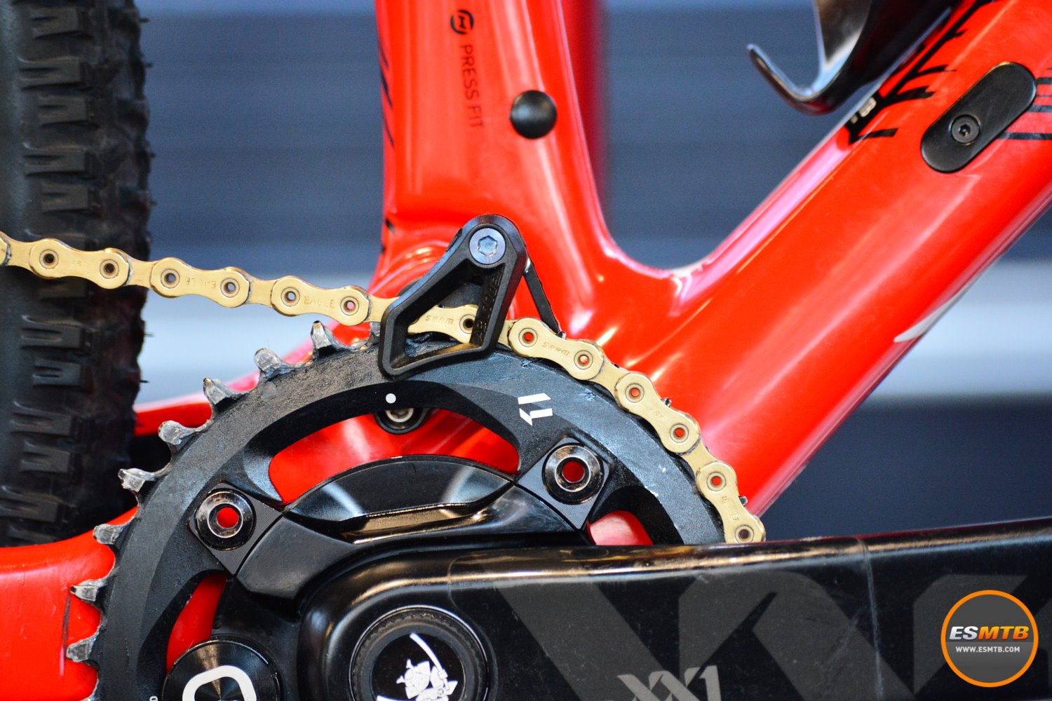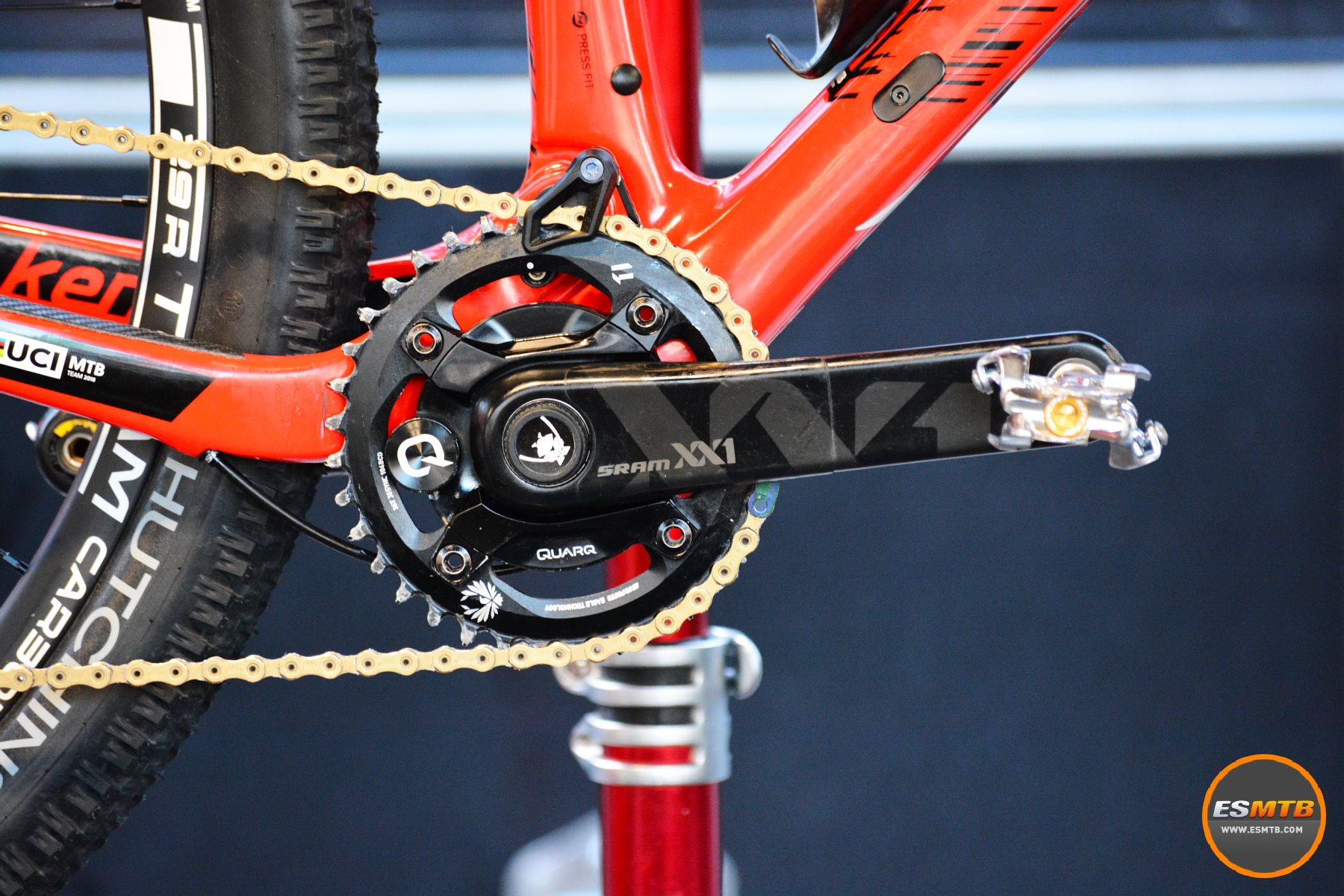 Un poco de todo. El hueco del eje de pedalier para llevar el kit Sahmurai Sword (un lugar perfecto donde es más difícil golpearlo que en el manillar), plato de 36 dientes, medidor de potencia Quarq, guía cadenas que se puede abrir fácilmente para poner o quitar la cadena y las bielas SRAM XX1