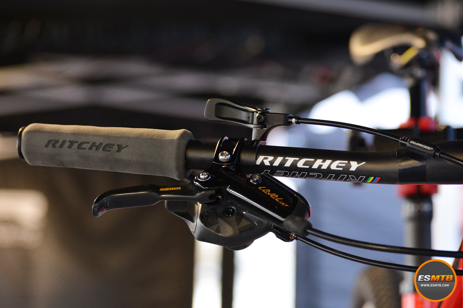 Manillar Ritchey, puños de espuma Ritchey, el mando de la tija telescópica y la maneta de los frenos SRAM Level LT