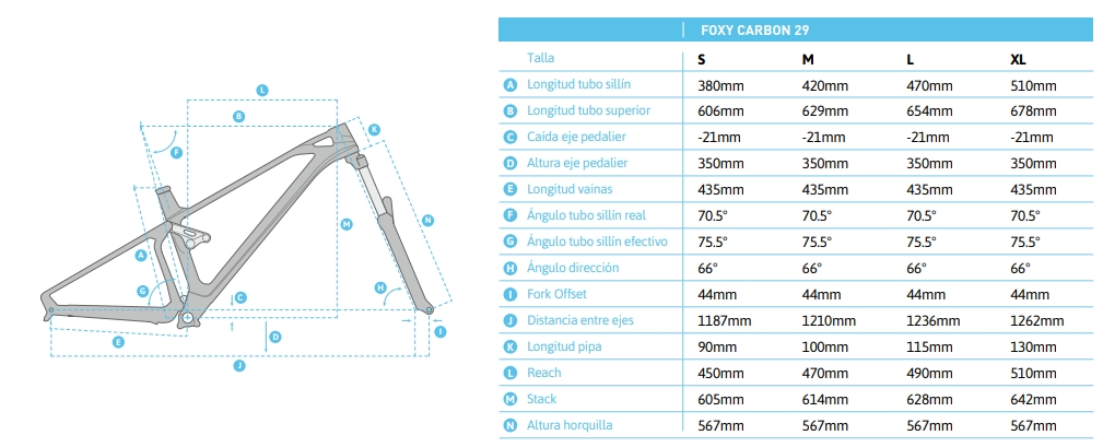 Forward Geometry también ha evolucionado para adaptarse a las ruedas más grandes con medidas geométricas específicas para lograr el mejor equilibrio geométrico, manejabilidad, agarre y rendimiento global y seguir marcando la pauta. Heredado directamente de Summum, Dune y Foxy Carbon 27’5“, el ángulo de dirección es ajustable en +/- 1º mientras que Foxy Carbon 29 va un paso más allá estrenando avances de horquilla más cortos que se combinan a la perfección con nuestra geometría referente Forward Geometry y largas cifras de reach convirtiéndose en la guinda del pastel ofreciendo claras mejoras de rendimiento: más estabilidad a mayor velocidad, mejor control de la rueda delantera y una mejoría espectacular en el agarre del neumático delantero.