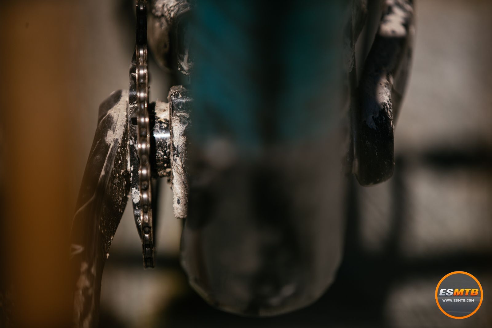 En búsqueda de lograr esas vainas ultra-cortas para una enduro de sólo 420mm han tenido que sacar espacio de todos los lugares. Para lograrlo han seguido la idea del Boost pero llevándola un poco más lejos. Los platos y general toda la transmisión se han desplazado 6mm hacia el exterior. Además de ganar espacio para la rueda se puede construir un basculante más sólido.