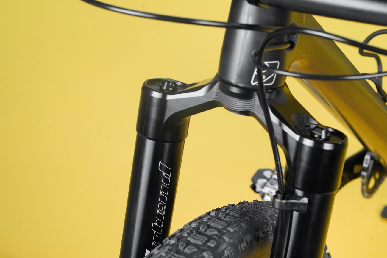 Para afrontar el desafío de integrar una rueda delantera de 32”, Bike Ahead recurrió a Intend Bicycle Components, fabricante alemán de referencia en suspensiones exclusivas. Su Samurai XC, una horquilla invertida con un recorrido ajustable de 90 a 120 mm, se configuró a 100 mm para este proyecto, con espacio suficiente para los neumáticos gigantes.