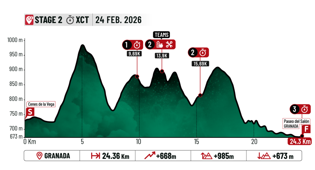 La contrarreloj arranca en Cenes de la Vega con una subida inmediata y contundente enlazando el Barranco de las Mansiegas y el Camino de los Neveros.