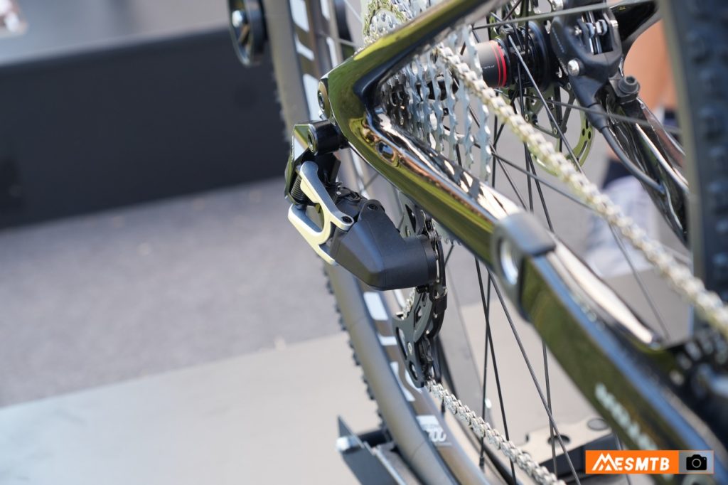 El cambio trasero está fabricado en aluminio y nylon reforzado con fibra de vidrio, y admite piñones de hasta 52 dientes en MTB (caja larga de 93 mm) o hasta 46 dientes en gravel (caja media de 75 mm). El peso declarado para la versión MTB es de 453 g con batería incluida.