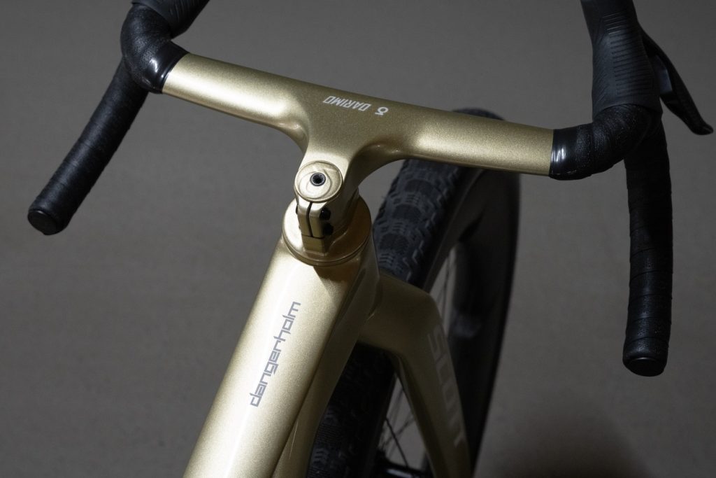 El sistema de cuña, tapa y espaciadores del juego de dirección es completamente personalizado para integrar el cableado interno y lograr una transición limpia entre cuadro y manillar.