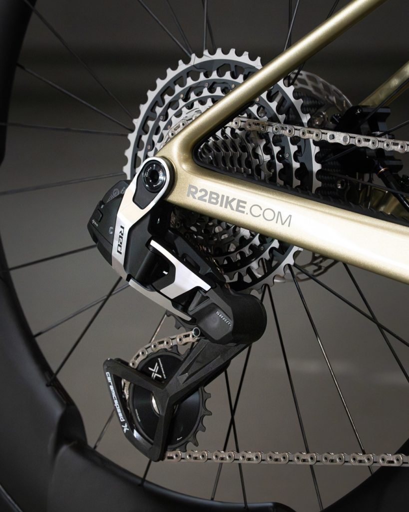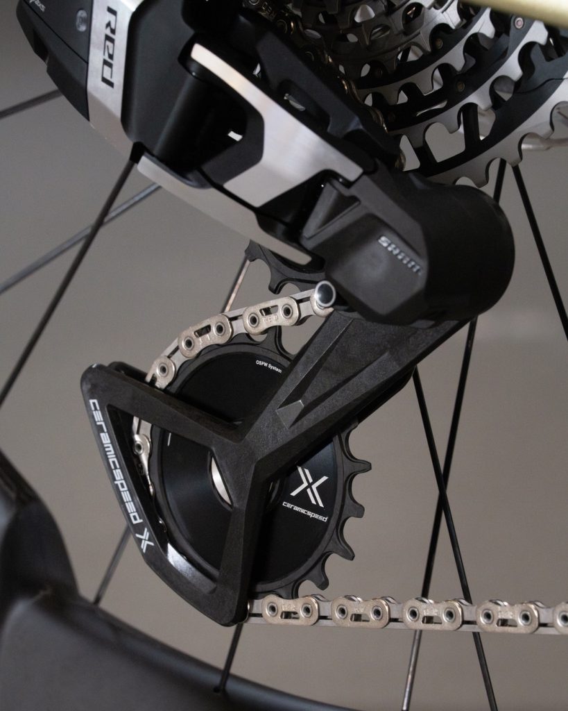 La base del grupo es SRAM RED XPLR, con cambio trasero específico y cassette 10-46 de 13 velocidades. El cambio incorpora una jaula CeramicSpeed OSPW X ALPHA, diseñada para reducir fricción y facilitar el mantenimiento.