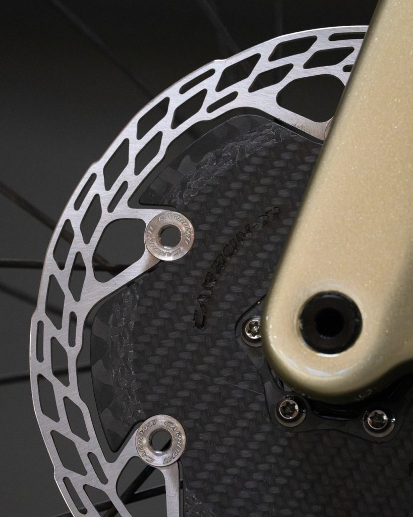 Los discos son Carbon-Ti X-Rotor Aero, con araña de carbono para reducir peso y optimizar la gestión térmica.