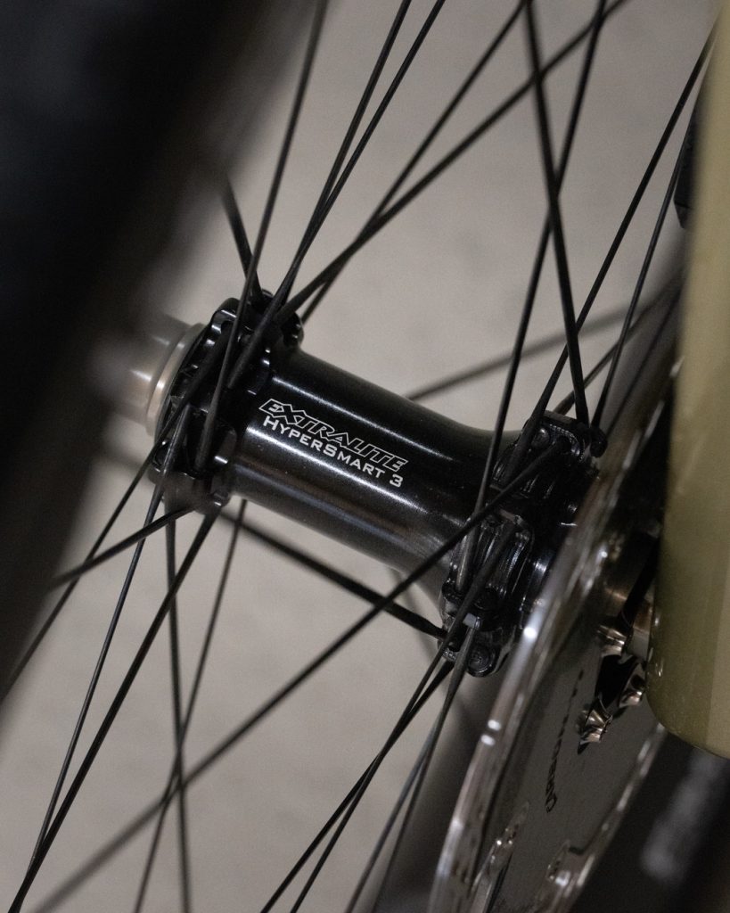 El montaje se completa con radios Alpina Hyperlite y bujes Extralite HyperSmart 3, compatibles tanto con espaciado gravel como Boost gracias a un kit de adaptación, y con núcleo XDR para el cassette de 13 velocidades.