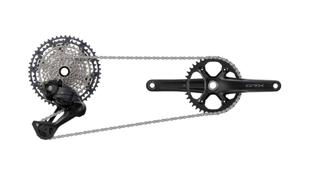 El sistema está concebido exclusivamente para configuraciones 1 x 12, combinando el cambio trasero GRX RX717 con cassettes Shimano 10-51T. El resultado es un rango de desarrollo amplio, pensado para afrontar desde pistas rápidas hasta terrenos rotos y pendientes exigentes.