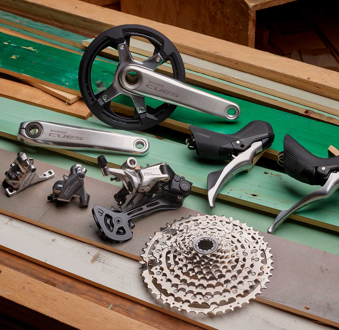 La familia CUES destaca por su versatilidad y compatibilidad entre componentes, lo que permite crear configuraciones personalizadas según el tipo de uso o el estilo de conducción. En esta edición especial, Shimano ofrece la posibilidad de combinar distintos conjuntos de frenos hidráulicos o mecánicos, de manillar plano o de carretera, todos con el característico acabado plata.