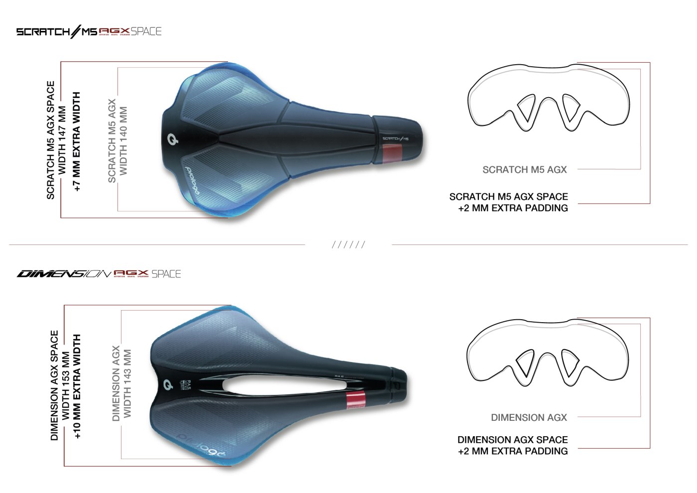 Las innovaciones de Prologo no se limitan al mundo de las carreras gravel. La línea AGX se amplía aún más con los nuevos Scratch M5 AGX Space y Dimension AGX Space. Los dos nuevos modelos Space, más anchos y acolchados que los sillines AGX, son ideales para: