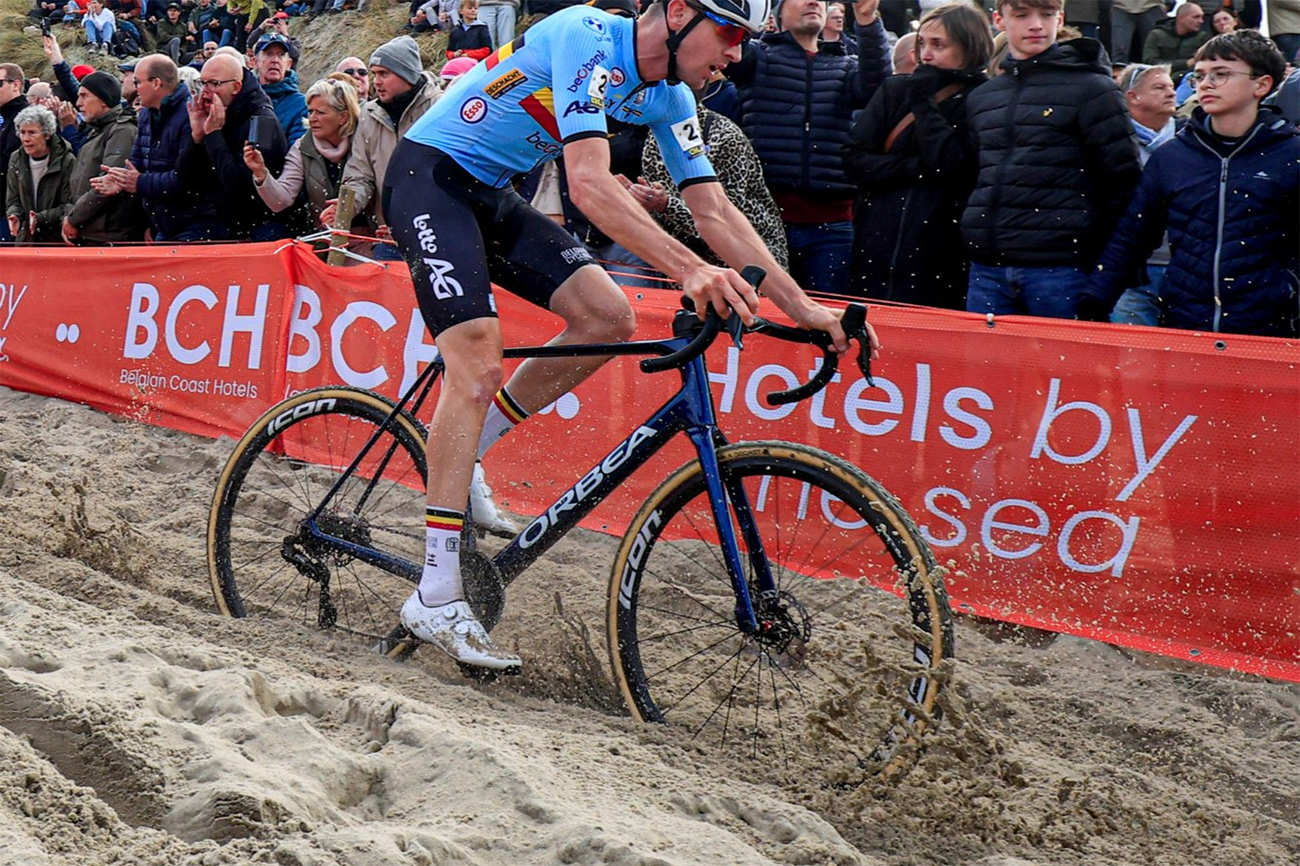 En condiciones secas, donde el barro no se acumula, el paso de rueda de una bici de carretera es suficiente para correr sin penalizaciones. Es justo lo que se vio en Middelkerke: un circuito rápido, seco y con zonas de arena, donde la ligereza y la reactividad de una bicicleta de carretera pueden incluso ser una ventaja. En este caso, Aerts usó el cuadro de la Orbea Orca montado con la horquilla de la Orbea Terra Race.