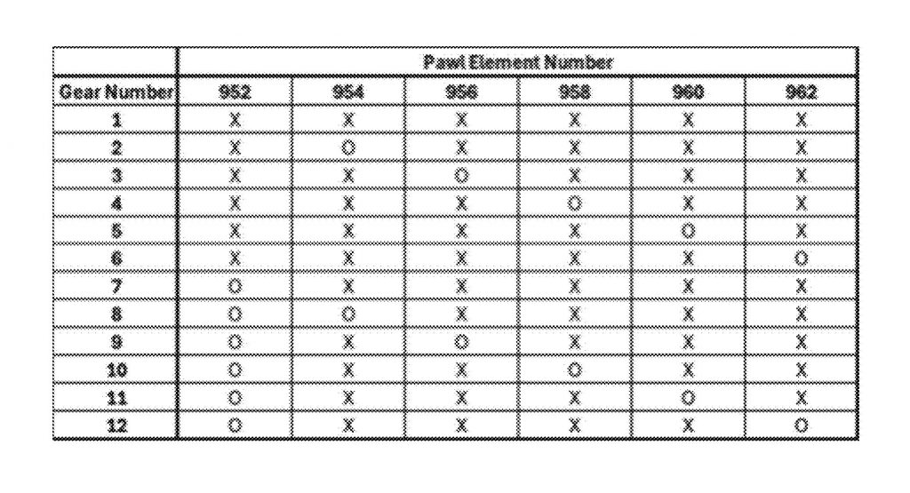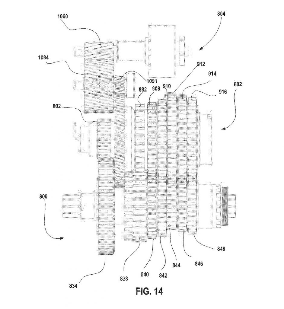 En el interior de esa unidad aparece un tren de engranajes apilados, típico de una caja de cambios interna, junto con mecanismos de acoplamiento e indexado que permiten seleccionar distintas relaciones. La patente entra incluso en el detalle de algunos elementos de engrane, como palancas internas, dientes y trinquetes diseñados para gestionar el acoplamiento del par dentro de un sistema cerrado.