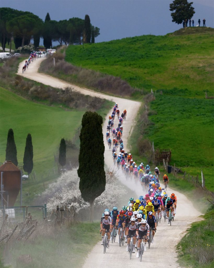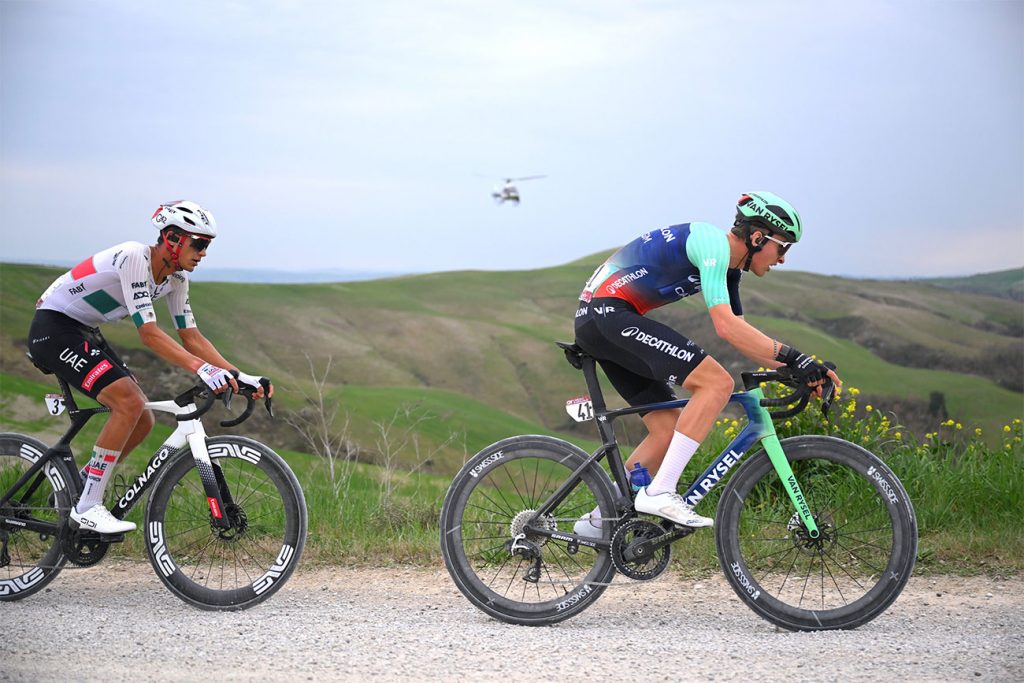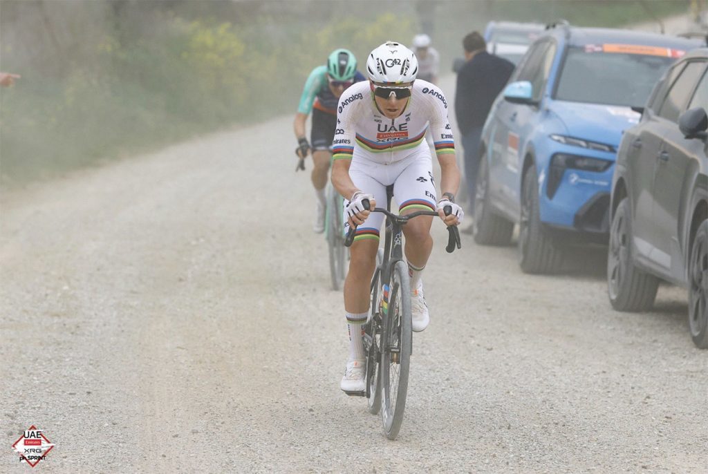 En los últimos cincuenta kilómetros la situación quedó prácticamente definida. Pogačar continuó gestionando su esfuerzo en los sectores de sterrato que restaban en el recorrido mientras el grupo perseguidor trataba de reorganizarse sin éxito. La diferencia se mantuvo alrededor del minuto y medio cuando la carrera entró en los últimos tramos de grava antes del circuito final en Siena.