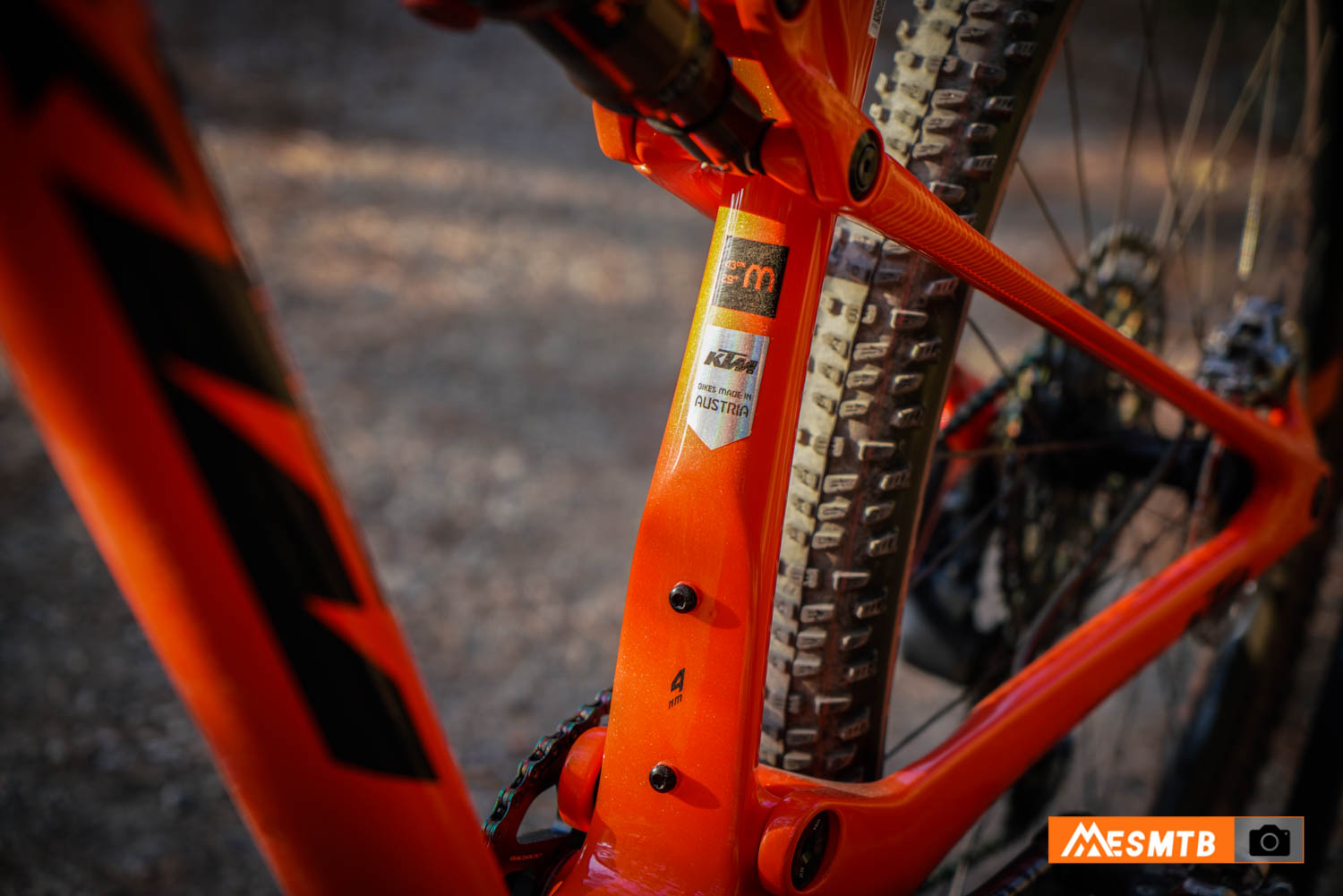 En resumen, la KTM Scarp brilla por su ligereza, su simplicidad y su comportamiento equilibrado. Una geometría moderna pero moderada que se traduce en un buen feeling en prácticamente todos los terrenos. No destaca especialmente en ninguno, pero lo hace todo bien. En cualquier situación donde el pedaleo sea importante su bajo peso y buena rigidez es una gran ayuda. Bajando en zonas rápidas transmite seguridad, y en los tramos más lentos la propia ligereza facilita los movimientos. La suspensión trasera es tirando a activa, tiene una buena sensibilidad inicial y se va endureciendo a medida que avanzamos en el recorrido hasta los 95 mm que da. Del montaje del modelo Exonic no hay absolutamente nada que poder criticar. En cuanto a estética, se ha pasado a un tono naranja-rojizo con un acabado de pintura de esos tan de moda que cambian ligeramente de tonalidad según la luz que recibe.