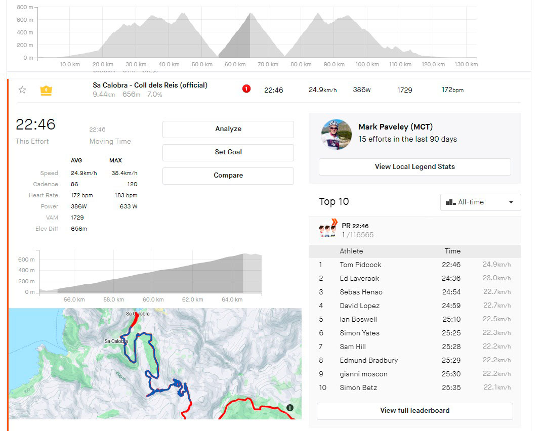 Pidcock ha subido a una potencia media de 386W durante los 22:46 que ha tardado en completar el segmento de Strava, rebajando en 1 minuto y 50 segundos el anterior KOM de Laverack. Tom Pidcock tiene un peso conocido de 58 kg, algo que siempre es complicado de validar en cada momento. Con esa cifra en mente, el inglés habría subido Sa Calobra a 6,6 w/kg en un segmento en el que su pico de potencia ha sido de 633 W.