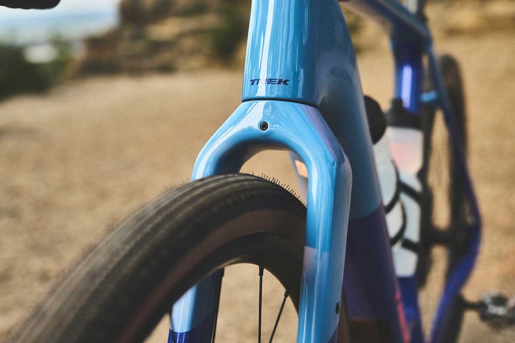 La bicicleta admite cubiertas de hasta 50 mm y es compatible con tijas telescópicas. En la versión superior, Checkpoint+ SL 7 AXS, monta de serie una horquilla RockShox Rudy XPLR de 40 mm, mientras que las SL 5 y SL 6 mantienen horquilla rígida de carbono.