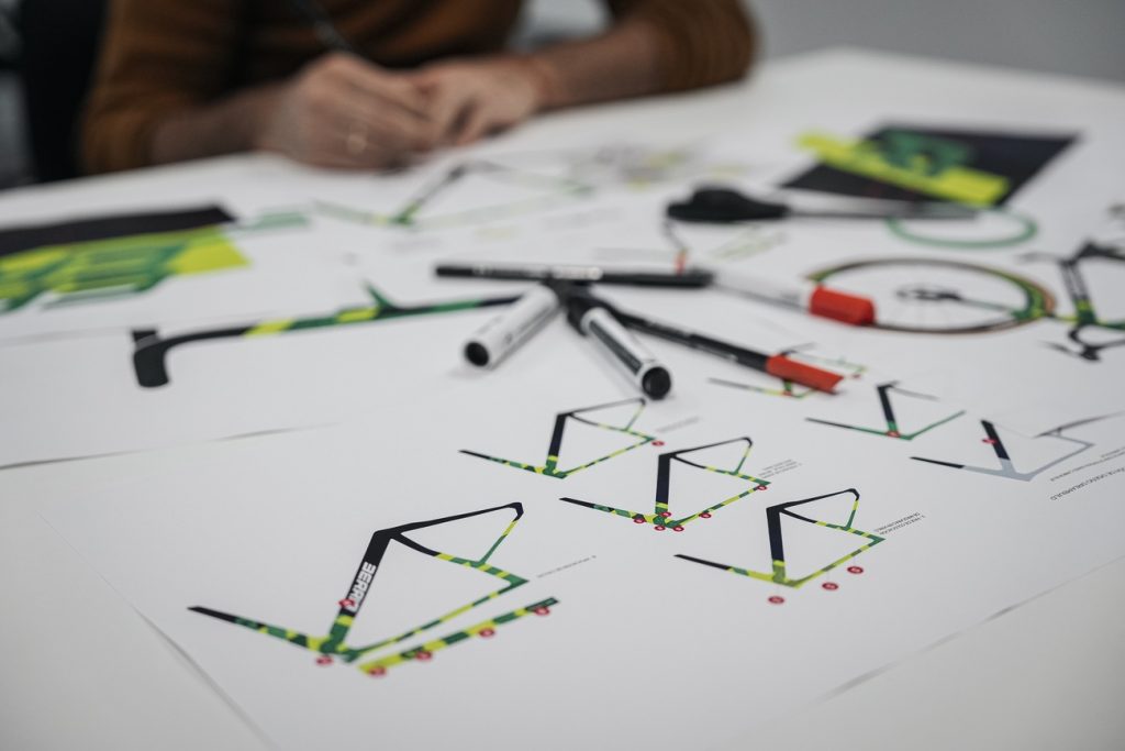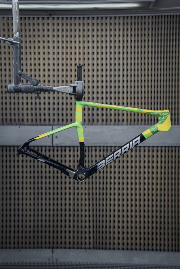 La base del proyecto es la plataforma Belador Force, el modelo aero light de alto rendimiento de la marca. El diseño gráfico parte del propio logotipo de Berria. Ha sido repetido, cruzado y fragmentado hasta formar un patrón que define todas las transiciones y cortes de color del cuadro, aportando sensación de movimiento y continuidad, y reforzando la identidad visual de esta edición especial.