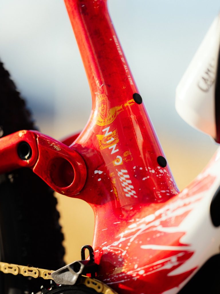 Sobre el amortiguador trasero, un inserto gráfico repasa los innumerables triunfos del suizo, en un guiño a su legado y al papel de sus socios técnicos —SRAM, RockShox, Syncros y Maxxis— que han acompañado cada paso de su carrera.